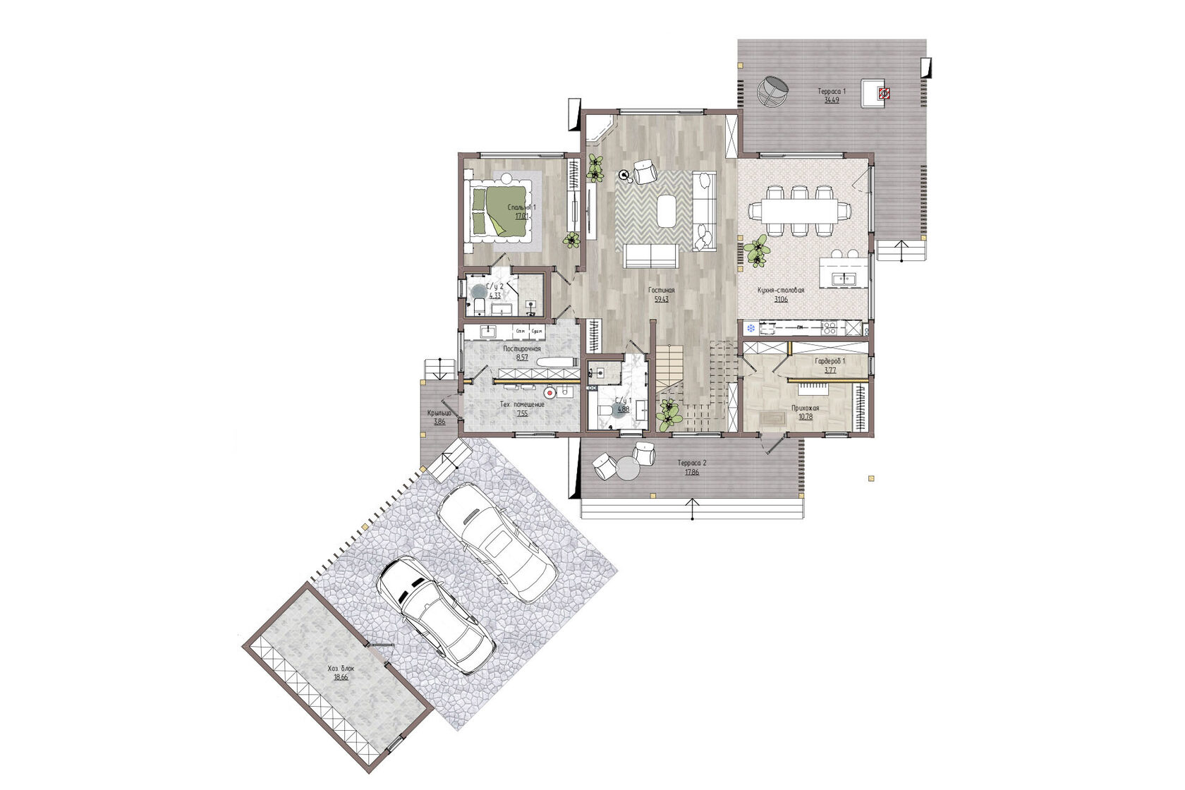 Проект включает два этажа для проживания. На первом размещена кухня, гостиная, есть холл, спальня и даже терраса, оборудованная отдельной гриль-зоной. Это еще не все. Площадь вмещает постирочную, две ванные комнаты, готовую оборудованную прихожую, отдельное помещение для хранения гардероба, плюс есть техническая комната и даже специальный хозблок с установленным навесом, под которым можно оставлять автомобили. Второй этаж тоже довольно вместительный. Там есть три комнаты для сна, балкон, 2 ванные комнаты и кладовая.